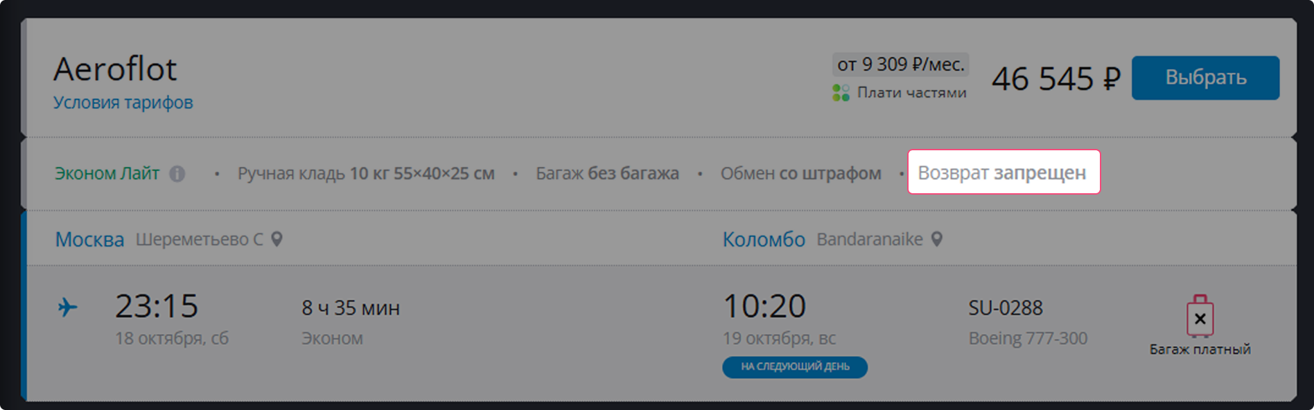 Обратите внимание на возможность возврата при покупке билета. В Anywayanyday о невозвратном тарифе свидетельствует надпись «возврат запрещен».