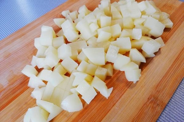 Все подготовленные ингредиенты соединяем вместе. Обратите внимание на кубики картошки. Все ровненько и аккуратненько. Никакой каши.