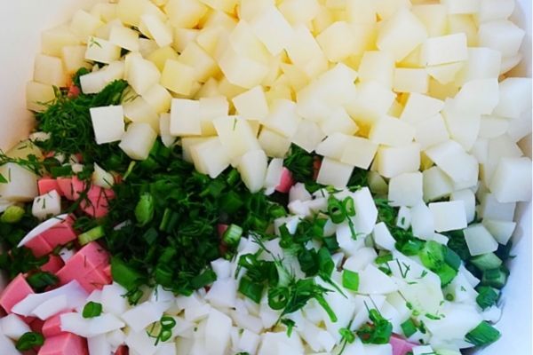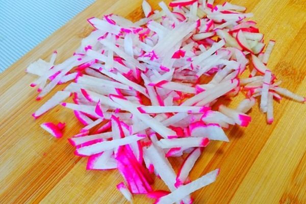Редис режем произвольно. Не очень крупно. Придерживаюсь правила, чтоб ингредиенты хорошо сидели в ложке и было удобно их употреблять.