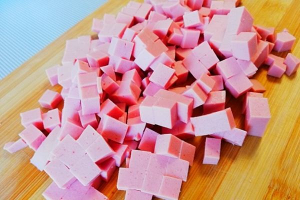 Колбасу или мясо режем кубиком или некрупной соломкой. Как Вам удобней. Для эстетики, лучше если начали все резать кубиком, все режем кубиком. Соломкой, значит соломкой.