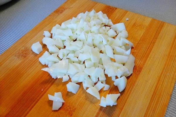 Белки и желтки разделяем. Желтки убираем в сторону, белки режем кубиками.