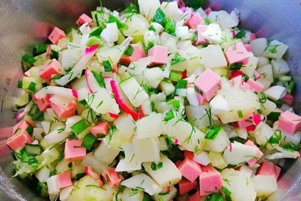 Добавляем к окрошке соль, все хорошо перемешиваем. Осталось приготовить заправку и добавить квас.